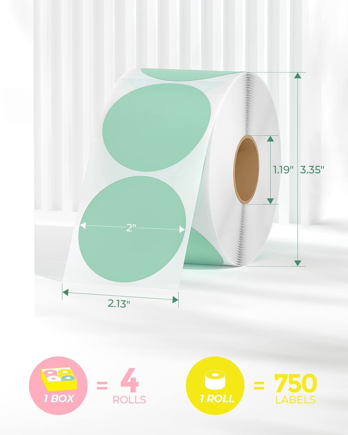 - Specifications: Authentic Munbyn labels. Round thermal sticker with the size: 2" circle (750 labels/roll, 1 roll, white), paper tube diameter:1.19"(30mm) paper roll diameter:3.35"(85mm). No ink toner or ribbons are needed!