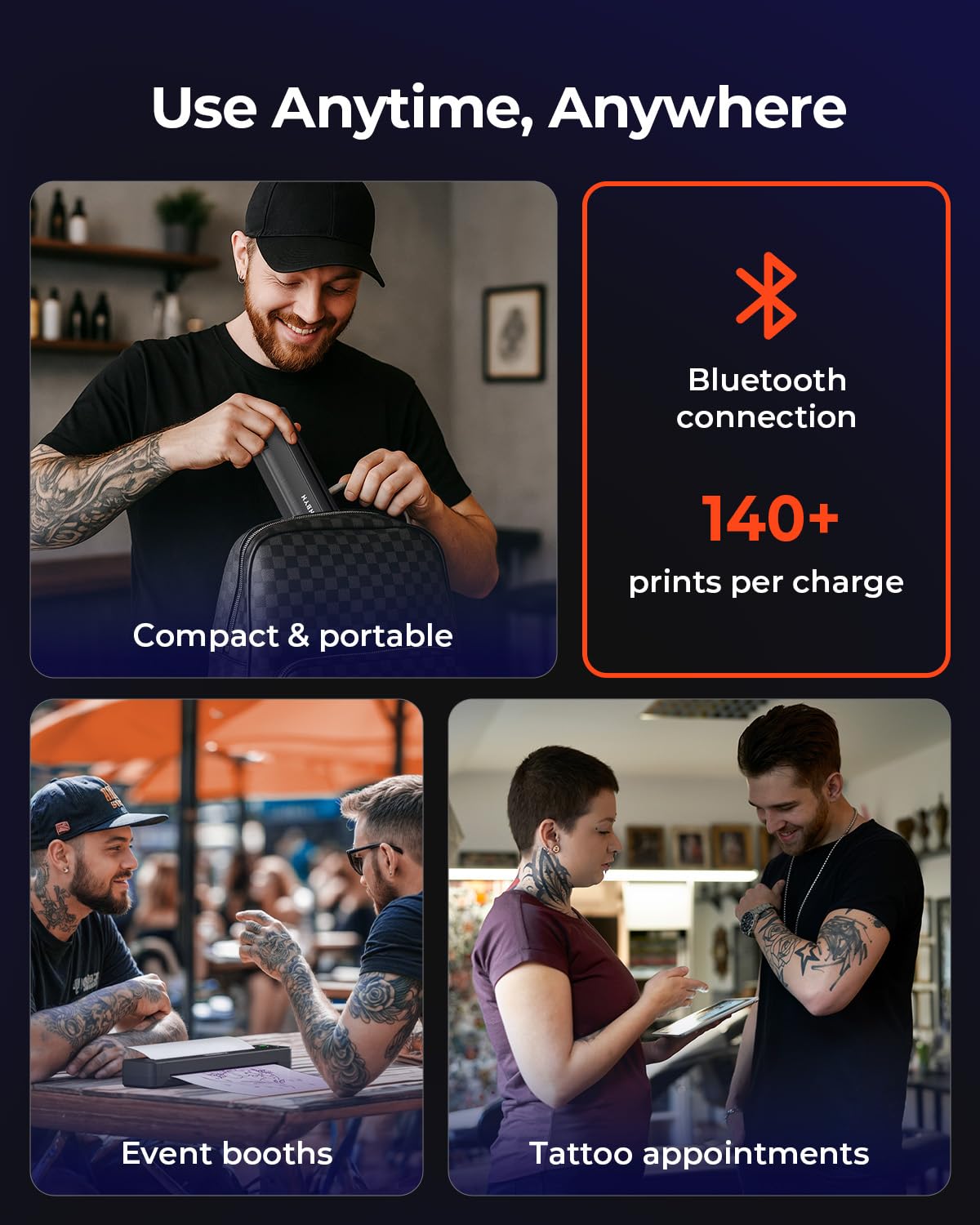 - Exceptional Durability: The tattoo stencil printer is engineered for long-lasting performance, capable of processing over 150,000 tattoo transfer papers and covering a total printing length of approximately 30 miles throughout its lifespan. Additionally, a single charge efficiently handles up to 140 sheets. Regular maintenance and proper charging (5V2A) are recommended to keep your printer in optimal condition