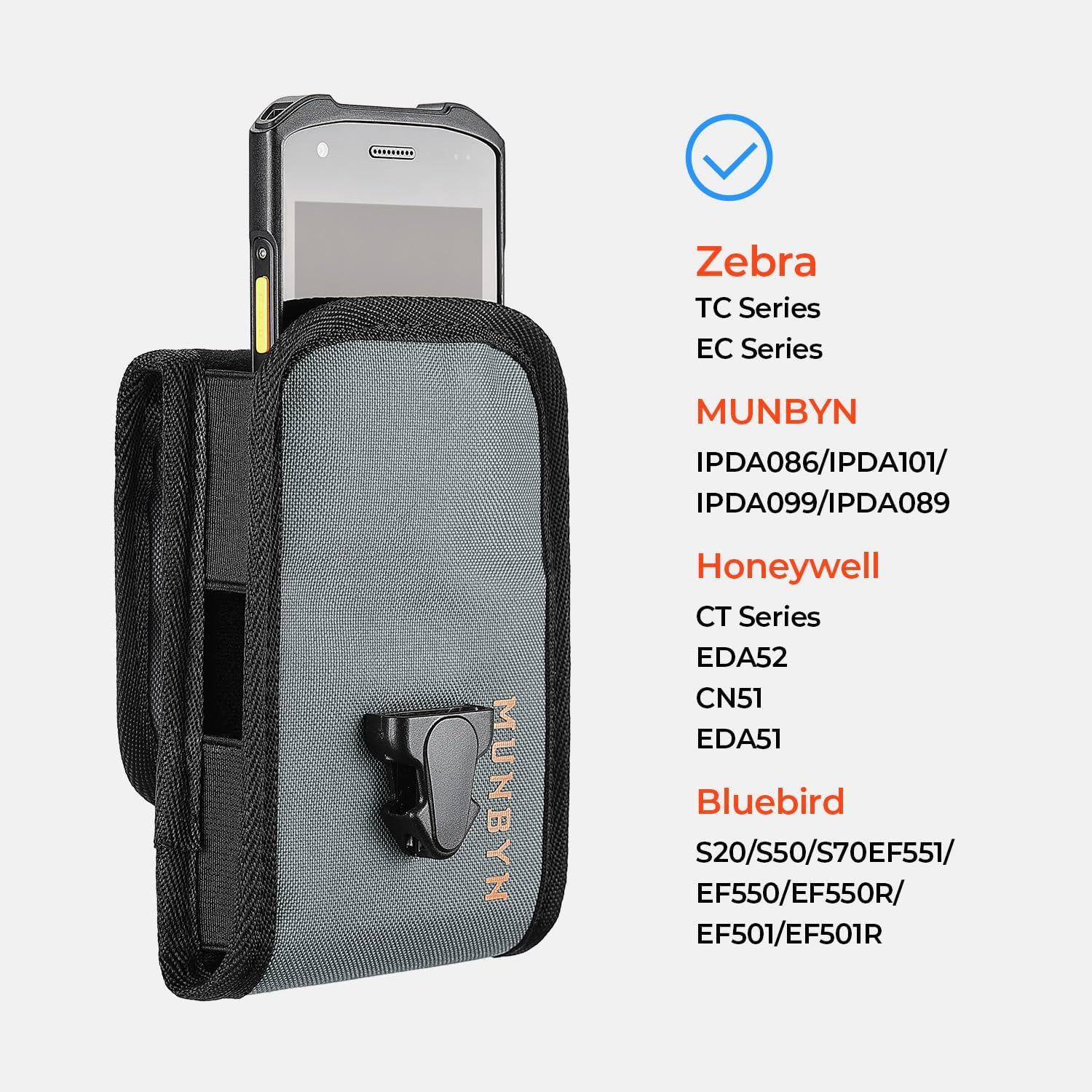 - [Compatibility] Scanner holster for Zebra handheld barcode scanners is compatible with almost all Zebra mobile computers without pistol grip, such as TC52/TC57, TC21/TC26, TC72/TC77, EC30 and so on. Note that it is not compatible with android barcode scanner with handles, such as MC9300. At the same time, this scanner case holder is also fully compatible with all MUNBYN mobile computers without handles.